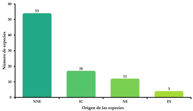Figura 5 Origen de las especies arbóreas forrajeras de la Península de Yucatán, México. IN: introducida. Naturalizada. IC: introducida-cultivada. NE: nativa endémica. NNE: nativa no-endémica.