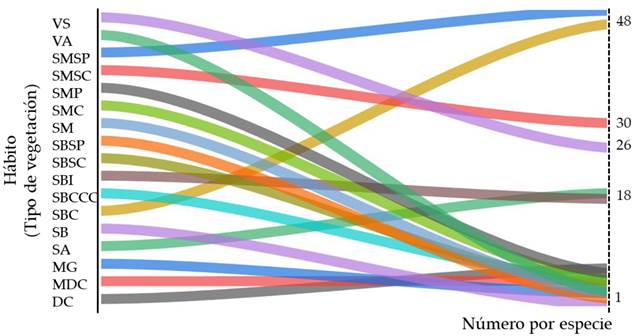 Asimismo, se observó que estas especies se distribuyen en 17 tipos distintos de hábitats, siendo la selva mediana subperennifolia y la selva baja subcaducifolia las de mayor diversidad con 48 y 46 especies (Figura 6).