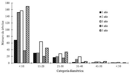 El promedio del DN es de 1.21 m, con un rango que oscila entre 2.0 y 64 cm. No se observaron diferencias estadísticas significativas (P > 0.05) en el promedio del DN entre los diferentes SAF. En la primera categoría diamétrica se concentró el 61.8% de los árboles registrados para todas las edades (Figura 2). El SAF de 3 años mostró la mayor área basal (AB), mientras que el de 4 años presentó la menor, siendo estadísticamente diferentes del resto de las edades (P < 0.0005). En cuanto al área de copa (AC), los SAF de 2, 3 y 5 años registraron los valores más altos, mientras que los de 1 y 4 años tuvieron las menores AC. Los altos valores de AC están relacionados con la densidad de árboles por hectárea presente en cada edad.