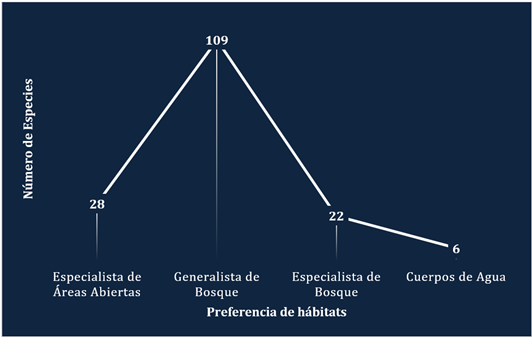 En cuanto a las preferencias de hábitat, la categoría GB (generalista de bosques) obtuvo un mayor número de especies registradas (109 especies), seguida de la categoría (EAA) especialista de áreas abiertas (28 especies). Esto coincide con Van-der Wal et al. (2012), quienes encontraron resultados similares en 38 sistemas agroforestales evaluados en Tabasco, no obstante, el número de especies EB (especialistas de bosques) es contrastante, ya que en su estudio sólo reportaron una especie de esta categoría, mientras que en este trabajo se identificaron 22 especies. Es posible que la diferencia radique en que los sistemas agroforestales estudiados por Van-der Wal et al. (2012) se encontraban a más de 2 km de los fragmentos de bosque natural más cercanos, mientras que, para este trabajo se evaluó una plantación rodeada de selva alta perennifolia en las laderas del Cerro Mono Pelón en Huimanguillo (plantación 8) en donde se registraron seis especies de esta categoría: Tinamus major, Penelope purpurascens, Crax rubra, Trogon caligatus, Amazona farinosa y Habia rubica. Esto coincide con Reitsma et al. (2001) quienes indican que la cantidad de especies EB disminuye a medida que la distancia de los bosques naturales incrementa, por lo que sugieren que las plantaciones de cacao proporcionan hábitats para un número considerable de especies, pero no pueden sustituir a los bosques naturales en la conservación de las aves.