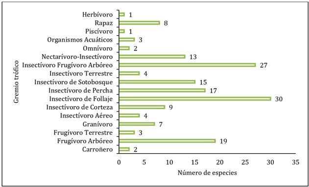 El gremio trófico predominante es el de los insectívoros de follaje (30 especies.) (Figura 3). Estas especies forrajean entre las hojas de cacao y árboles de sombra en busca de artrópodos. Generalmente son especies migratorias de talla pequeña que pertenecen a las familias Parulidae, Vireonidae y Polioptilidae con algunas excepciones. El siguiente gremio es el de los insectívoros-frugívoros arbóreos (27 especies). Estas especies forrajean entre las ramas de los árboles en busca de insectos, pero son capaces de alimentarse de hojas, frutos y néctar, dependiendo la disponibilidad de recursos. Por lo general son especies de talla mediana que pertenecen a las familias Icteridae, Thraupidae y Cardinalidae. En tercer lugar, se encuentra el gremio frugívoro arbóreo (19 especies). Estas son especies con picos fuertes de las familias Psitacidae, Trogonidae y Cracidae.