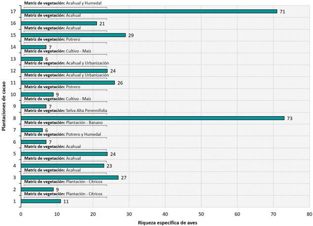La riqueza de especies identificadas en campo parece responder favorablemente a la calidad de matriz circundante en cada parcela, incluso más que la superficie de la plantación. Por ejemplo, la plantación 8 con 6 ha de superficie y matriz de selva alta perennifolia, presentó un mayor número de especies (73 especies) en comparación con la plantación 17 constituida por 50 ha y una matriz de vegetación secundaria y humedales (71 especies). Asimismo, las plantaciones que presentaron un número menor de especies son las que se encuentran rodeadas de monocultivos o potreros. Esto, coincide con Ibarra et al. (2001) y Trejo-Pérez (2007), quienes mencionan que la riqueza de aves en el agroecosistema cacao incrementa en función de la heterogeneidad del paisaje. Es importante destacar que el esfuerzo de muestreo fue variable en cada parcela, por lo que se recomienda realizar un estudio sistemático y además comparar otros factores como la composición y estructura vegetal; el manejo agrícola y cobertura arbórea en cada plantación.