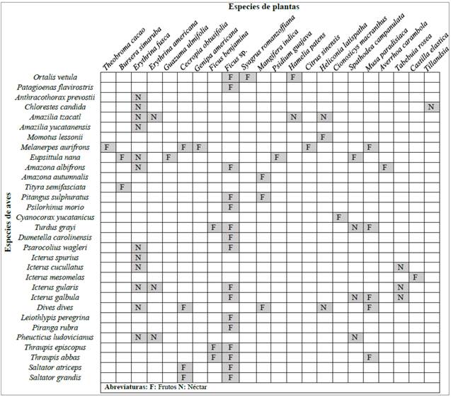 Los ítems alimentarios que no habían sido registrados en la dieta de las aves fueron: los frutos del coralillo (Hamelia patens) y la palmera pindó (Syagrus romanzoffiana) en la dieta de la chachalaca oriental (Ortalis vetula). El fruto del ave del paraíso (Heliconia latispatha) para el momoto corona negra (Momotus lessonii). La sandía de pea (Cionosicys macranthus) para la chara yucateca (Cyanocorax yucatanicus). La jagua (Genipa americana) y el guarumo (Cecropia obtusifolia) para el carpintero chejé. El fruto del árbol de caucho (Castilla elástica) para la calandria cola amarilla (Icterus mesomelas). El tulipán de la India (Spathodea campanulata) para el mirlo café (Turdus grayi). El colorín (Erythrina americana) para el picogordo degollado (Pheucticus ludovicianus). La flor del gallito (Erythrina fusca) para todas las especies que indica la matriz, exceptuando la calandria de Baltimore (Icterus galbula) y el colibrí garganta negra (Anthracothorax prevostii), de las cuales ya existían registros previos. Para el género Ficus en la dieta del chipe peregrino (Leiothlypis peregrina) y la oropéndola cabeza castaña (Psarocolius wagleri). Resultando en un total de 21 nuevos registros en la dieta de aves neotropicales (Figura 6).