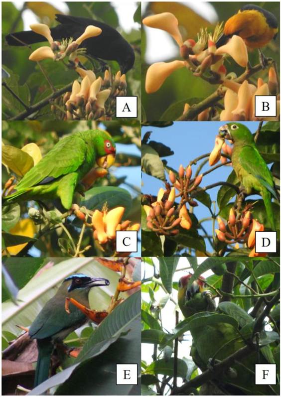 Figura 6 Representación de algunas interacciones tróficas ave-planta en el agroecosistema cacao en Tabasco, México: A) Dives dives, B) Icterus gularis, C) Amazona albifrons y D) Eupsittula nana; alimentándose de Erythrina fusca; E) Momotus lessonii ingestando fruto de Heliconia latispatha y F) Amazona autumnalis alimentándose de Mangifera indica.