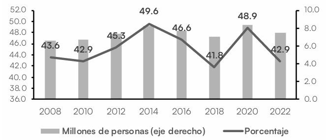 En el caso de México el problema de la pobreza es un tema que continúa en la agenda social del gobierno. De acuerdo con los indicadores de pobreza multidimensional del Consejo Nacional de Evaluación de la Política de Desarrollo Social (CONEVAL), en la primera estimación de 2008, 44.4% de la población se encontraba en condición de pobreza, para 2022 la pobreza había disminuido a 36.3%, lo que significó que 2.7 millones de personas dejaron su condición de pobreza (CONEVAL, 2023). Sin embargo, en el transcurso del tiempo los niveles de pobreza persisten y en algunos años, entre 2010 y 2014, se presentaron porcentajes más altos. En 2010 46.1% de la población se encontraba en situación de pobreza, lo que equivalía a 52.8 millones de personas, además en este año también se registró el mayor número de personas en condición de pobreza extrema (11.3%), incrementos en la pobreza que se justifican como resultado de la crisis financiera de 2008-2009 (CONEVAL, 2016).