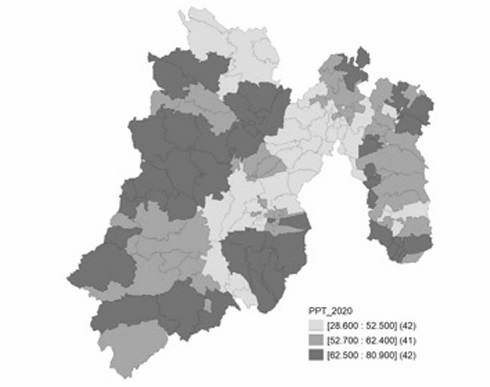 Estos indicadores agregados para la entidad se complican al analizarse a nivel de sus regiones, sobre todo porque existen municipios en los que la concentración de la pobreza es mayor y, más aún, en los que estas concentraciones de pobreza conllevan a fenómenos más complejos, entre ellos la marginación, la exclusión social y la desigualdad. El mapa 1 es ilustrativo, los mayores porcentajes de pobreza se concentran en la zona sur de la entidad, en el noroeste y en algunos municipios conurbados a la CDMX. En específico, en 2020, el municipio que registró el mayor porcentaje de pobreza fue Ixtapan del Oro con 80.9% de total de su población, mientras que el que resultó con menor porcentaje fue Coacalco de Berriozábal con 28.6%; sin embargo, si se observa el problema de la pobreza en niveles, el municipio que aglomera un mayor número de pobres es Ecatepec de Morelos con 786,391 personas. Una característica adicional de este municipio es que, a nivel nacional, también ocupa el primer lugar en número de personas pobres (CONEVAL, 2021).