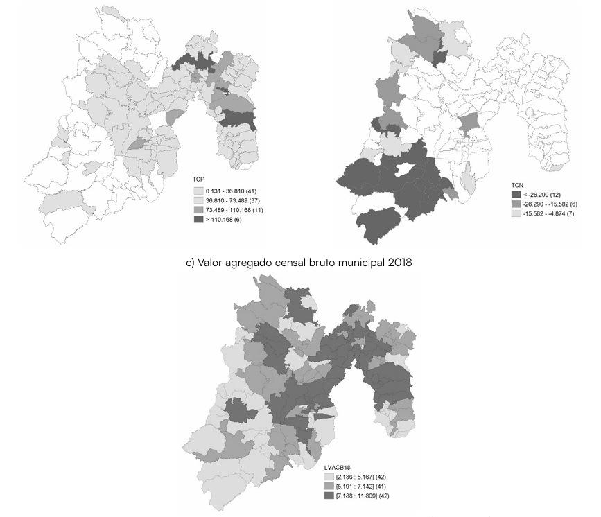 El mapa 2 ilustra, en el panel a, los municipios que registraron tasas de crecimiento positivas en el número de personas en condición de pobreza; destacan las dos zonas metropolitanas de la entidad con los colores más intensos. Se debe anotar que, en la Zona Metropolitana de Toluca, Lerma es el único municipio que no registró aumento en sus niveles de pobreza; por el contrario, fue el segundo municipio de toda la entidad que tuvo la mayor disminución. Al otro extremo, en el panel b del mapa 2, se encuentran los municipios que han tenido tasas de crecimiento negativas. De acuerdo con esta información, se concentran en el lado oeste de la entidad; destaca Zacualpan que logró disminuir casi la mitad de su población que se encontraba en condición de pobreza (su tasa de crecimiento fue de -48.5%); en segundo lugar, se encuentra Sultepec que registró un crecimiento de -44.3% y, en tercer lugar, Timilpan con una tasa de -34.3%. Si se observan estos mapas, que ilustran el crecimiento de la pobreza en los municipios, en relación con el tamaño de los municipios por los niveles de su valor agregado censal bruto (VACB) (ver panel c del mapa 2), se identifica una regularidad importante, el hecho de que los municipios en los que se registraron las mayores tasas de crecimiento de la pobreza, corresponden a los municipios con los niveles más altos de VACB, lo que sugiere que la actividad económica que prevalece en los municipios no ha sido suficiente para contribuir a la de reducción de la pobreza en los municipios del Estado de México