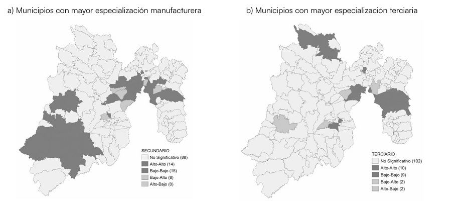 Los municipios en los que predomina el sector terciario se ubican en una parte de la zona oriente de la entidad conformando un clúster de 10 municipios, en la periferia del cluster se localizan dos municipios más con un rango bajo pero que su cercanía con el clúster podría permitirles alcanzar un mayor nivel de especialización. Por otro lado, se identificaron dos aglomeraciones: una al norte y otra cercana a la Zona Metropolitana del Valle de Toluca en los que el nivel de especialización en actividades terciarias es muy bajo.