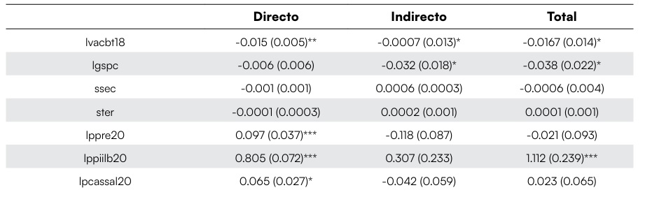 Con relación a los efectos indirectos o de difusión espacial, se registra evidencia de que el porcentaje de la población con ingreso inferior a la línea de bienestar (lpiilb20) no genera efectos indirectos; lo que indicaría que, el hecho de que un municipio se caracterice porque un porcentaje relativamente alto de su población reciba un ingreso inferior a la línea de bienestar, no es factor que influya en los niveles de pobreza de los municipios vecinos. Las demás variables aportan elementos para sugerir que las condiciones de pobreza de los municipios no son ajenas a lo prevalece en los municipios vecinos.