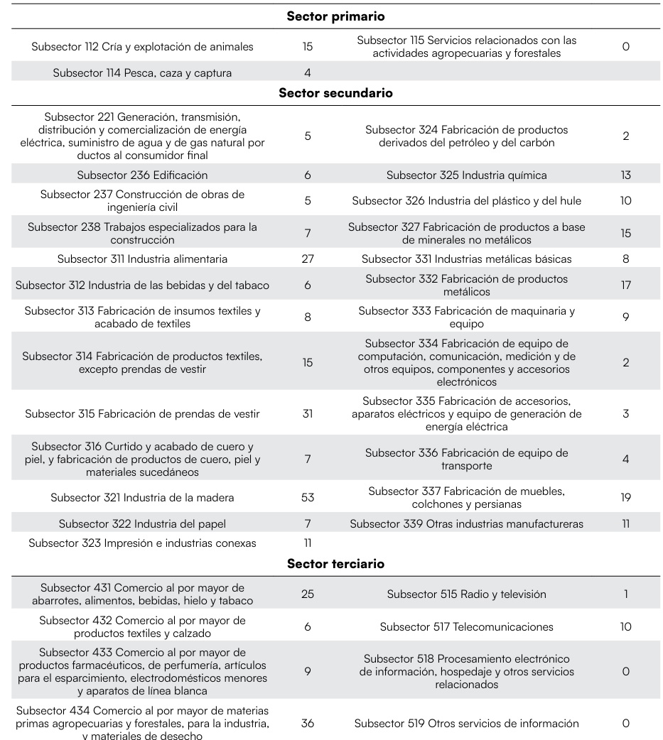 | Subsector 315 Fabricación de prendas de vestir | 31 | Subsector 335 Fabricación de accesorios, aparatos eléctricos y equipo de generación de energía eléctrica | 2 |