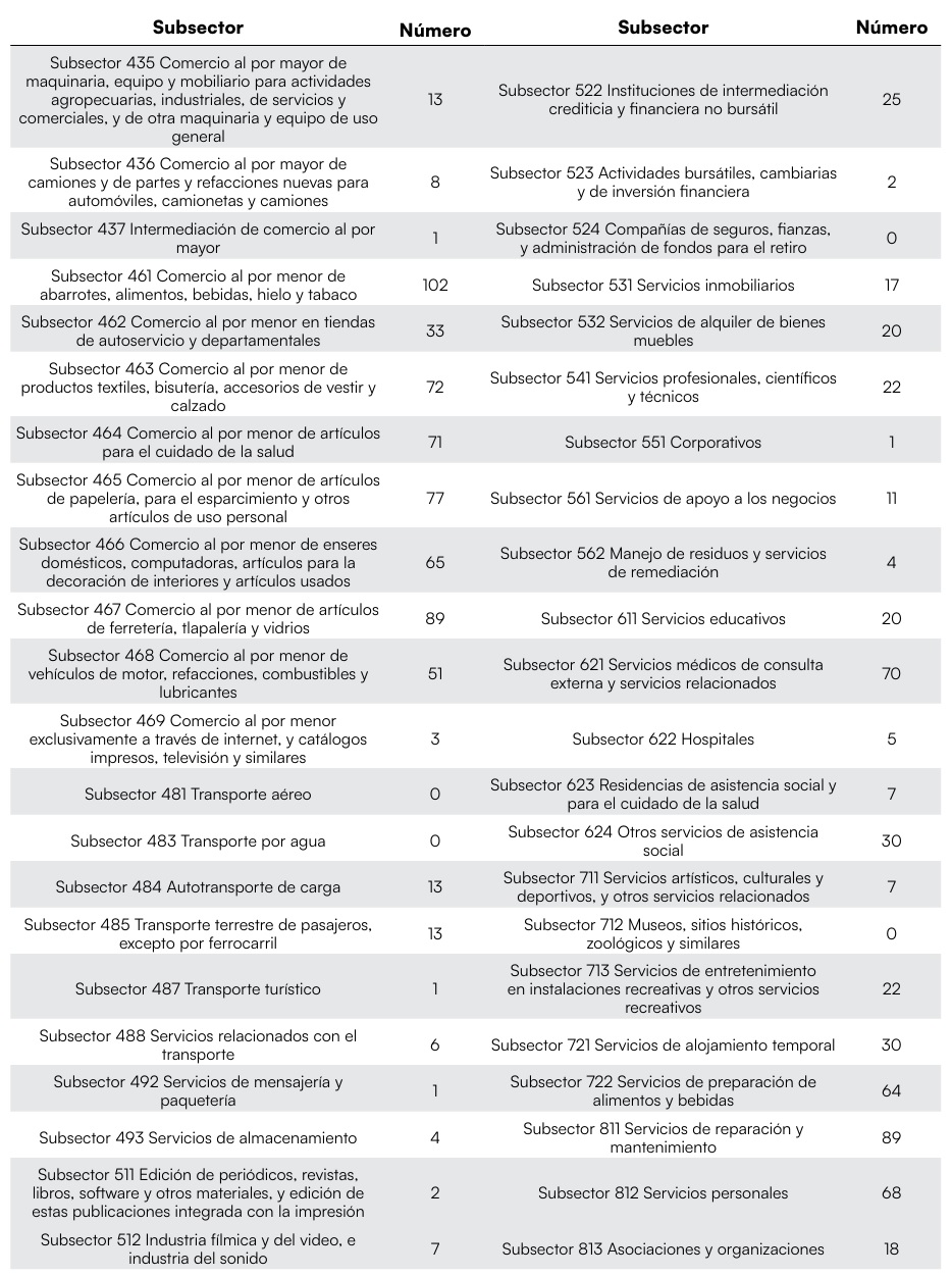 | Subsector 435 Comercio al por mayor de maquinaria, equipo y mobiliario para actividades agropecuarias, industriales, de servicios y comerciales, y de otra maquinaria y equipo de uso general | 13 | Subsector 522 Instituciones de intermediación crediticia y financiera no bursátil | 25 |