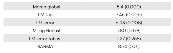 Para el análisis que aquí se presenta, primero se estimó un modelo por mínimos cuadrados ordinarios, sin efectos espaciales. Se aplicaron las pruebas de diagnóstico LM lag y LM error, en su versión estándar y robusta, para valorar la estimación de efectos espaciales más consistente para capturar el efecto de la vecindad entre municipios para la explicación de la pobreza en el Estado de México (véase cuadro 2). Una vez que se identificó la presencia de efectos espaciales se procedió a estimar los modelos de efectos espaciales: de rezago espacial (SAR), de error espacial (SEM), el modelo combinado (SARAR) y el modelo Durbin espacial (SDM). Posteriormente se estimaron los impactos directos, indirectos y totales.