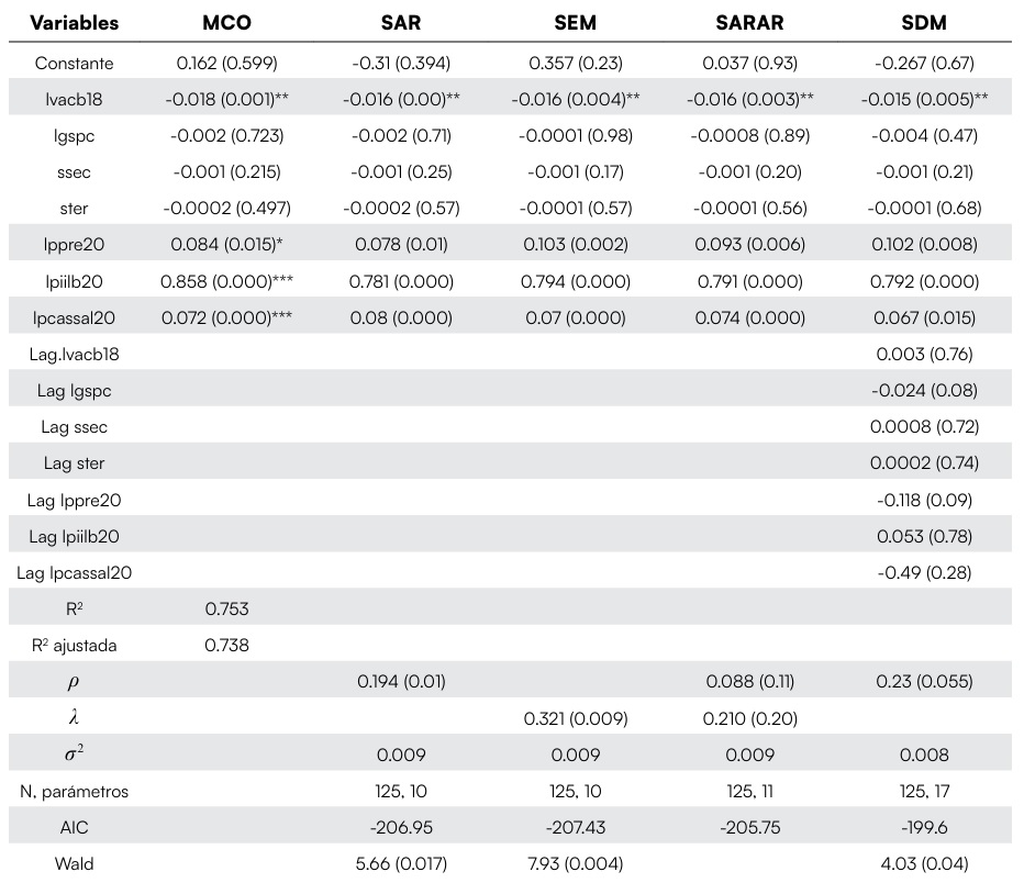 Se estimaron, entonces, las diferentes posibilidades de los modelos de efectos espaciales y, a partir de los criterios de selección, se finalizó con un SDM, cuyos resultados se presentan en el cuadro 3. Lo que se destaca, es parte de la estructura de los factores que pueden explicar la pobreza que prevalece en los municipios del Estado de México. En específico, la actividad económica de los municipios, medida por el valor agregado censal bruto (lvacb18), en las diferentes propuestas de estimación resultó estadísticamente significativa y con el signo de estimación adecuado. El argumento de esta afirmación responde a la posibilidad de que un incremento en la actividad económica de los municipios permita una mayor producción y, en consecuencia, que podría contribuir a la reducción de la pobreza (véase cuadro 3).