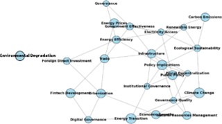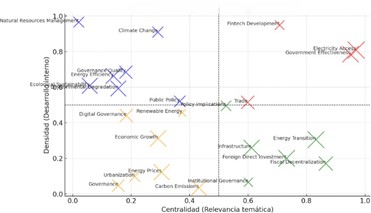 El análisis temático de la evolución del modelo de gobernanza para la energía sostenible muestra que el desarrollo de políticas energéticas ha estado influenciado por factores como la transición energética, la descentralización fiscal y la sostenibilidad ambiental. En la parte superior derecha de la Figura 7, los temas “Electricity Access”, “Government Effectiveness” y “Fintech Development” aparecen como motores clave, lo que indica que la modernización del sector ha sido impulsada por mejoras en el acceso a la electricidad, la digitalización y la eficiencia gubernamental. En general, la Figura 7 refleja una transición hacia un modelo más integrado y descentralizado, donde la inversión, la eficiencia regulatoria y la digitalización desempeñan un papel clave en la modernización del sector y la promoción del desarrollo sostenible.