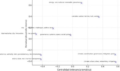 El análisis temático de la evolución de las estrategias de gobernanza multinivel muestra que la coordinación entre niveles de gobierno ha estado influenciada por la transición energética, la descentralización política y la mitigación del cambio climático. En la parte superior derecha de la Figura 8, los temas “climate”, “coordination”, “governance”, “mitigation” y “policy” aparecen como motores clave, lo que indica que la gestión del cambio climático y el diseño de políticas de mitigación han sido prioridades en la gobernanza multinivel. En síntesis, la Figura 8 refleja una evolución hacia un modelo de gobernanza multinivel más coordinado y descentralizado, donde la mitigación del cambio climático, la transición energética y la cooperación intergubernamental son fundamentales para la formulación de políticas efectivas.