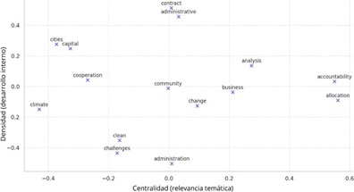 El análisis temático de la evolución de las APP en la gobernanza de infraestructura verde muestra que su desarrollo ha estado influenciado por la cooperación, la rendición de cuentas y la sostenibilidad. En la parte superior derecha de la Figura 9, los temas “accountability” y “allocation” aparecen como motores clave, lo que indica que la gestión eficiente de recursos y la transparencia en la administración han sido prioridades tanto en la investigación como en la formulación de políticas. En resumen, la Figura 9 refleja una transición hacia un modelo de gobernanza de APP más orientado a la transparencia, la eficiencia administrativa y la sostenibilidad, donde la asignación de recursos y la cooperación entre actores juegan un papel clave en la implementación de infraestructura verde.