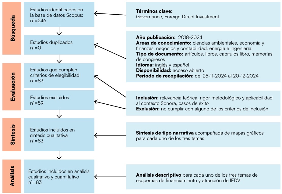 Los 246 artículos obtenidos en la etapa de búsqueda, correspondientes al periodo 2018-2024, son el resultado de la ecuación formulada. Éstos se sometieron a un proceso de evaluación basada en su relevancia teórica, rigor metodológico y aplicabilidad práctica. Se priorizaron aquellos estudios que presentaron perspectivas innovadoras o casos de éxito relevantes para la región de Sonora y la diversificación de fuentes de financiamiento para el Plan Sonora. Como resultado, 83 estudios cumplieron con los criterios de elegibilidad. Tras la revisión de títulos y resúmenes, se excluyeron 59 documentos por no cumplir con los criterios de inclusión establecidos.
