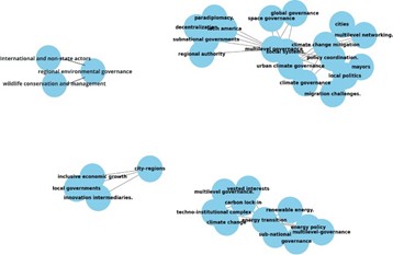 La Figura 5 evidencia una evolución en la discusión sobre la gobernanza multinivel, particularmente en su vínculo con la transición energética y el cambio climático. Un clúster central en torno a “multilevel governance”, conectado con “subnational governments”, “regional authority” y “policy coordination”, indica que la descentralización y la coordinación intergubernamental son elementos centrales en la formulación de estrategias para la gestión climática. En conjunto, la Figura 5 refleja una transición hacia una agenda más estructurada, donde la descentralización, la cooperación intergubernamental y la integración de políticas climáticas y energéticas son fundamentales para abordar el cambio climático de manera explícita.