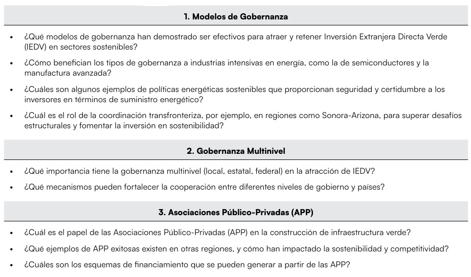 | • ¿Cuál es el rol de la coordinación transfronteriza, por ejemplo, en regiones como Sonora-Arizona, para superar desafíos estructurales y fomentar la inversión en sostenibilidad? |