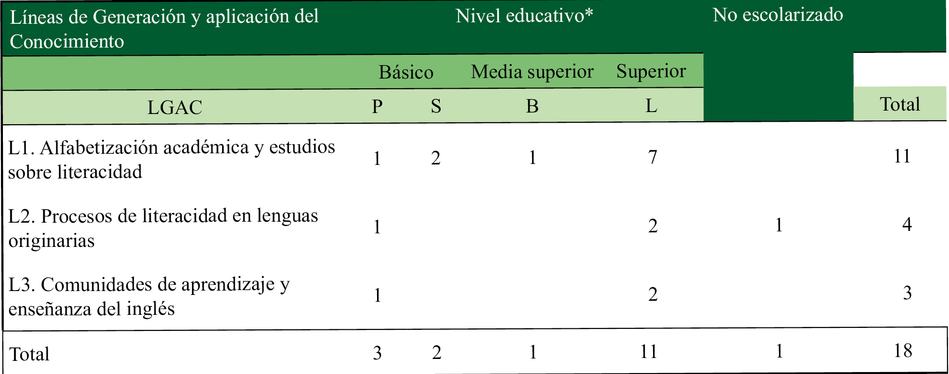Notas*L1 = Alfabetización académica y estudios sobre literacidad; L2 = Procesos de literacidad en lenguas originarias; L3 = Comunidades de aprendizaje y enseñanza del inglés. ** P = Primaria; S = Secundaria; B = Bachillerato; L = Licenciatura; NE = No escolarizado.
