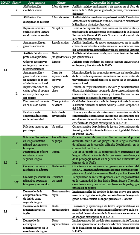 | LGAC* | Nivel** | Área temática | Género | Descripción del estudio |