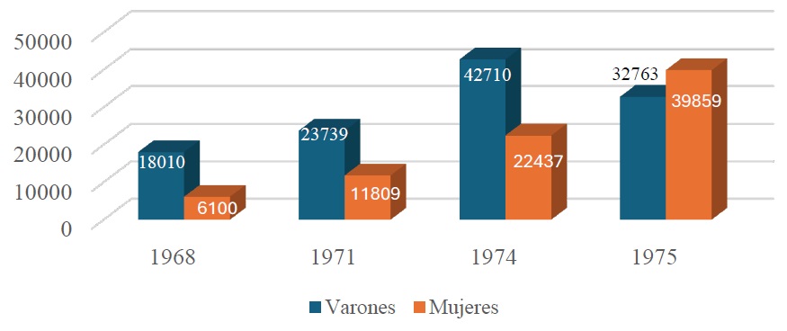 Fuente: 1968: DEE (1969, p. 31). Para 1971: González y Narváez (1971, p. 12) y DEE (1975d, p. 2), en estos dos documentos los números arrojados casi coinciden, pero presentan una diferencia mínima. Para 1974: DEE (1975c, p. 126). Para 1975: DEE (1976, p. 71). En la mayoría de los casos, el dato vertido era el de matrícula masculina por sobre la total, número del que se dedujo la matrícula femenina.