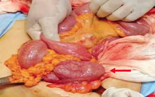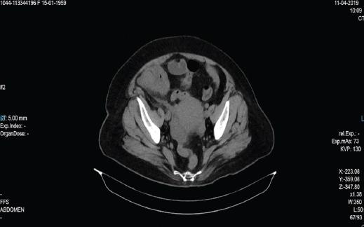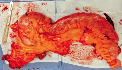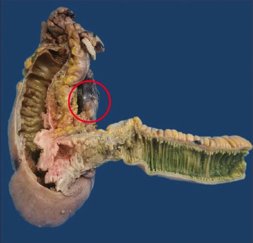 Mujer de 60 años, con antecedentes de diabetes tipo 2 e hipertensión arterial sistémica; niega antecedentes quirúrgicos. Inicia su padecimiento actual un día antes de su valoración con dolor de tipo cólico en el hipocondrio derecho, de intensidad 7/10 en la escala numérica del dolor, irradiado al cuadrante inferior derecho, acompañado de distensión abdominal, náusea llegando al vómito de contenido gastroalimentario en tres ocasiones, sin exacerbantes ni atenuantes; de manera ocasional, en las últimas 12 horas se presentó con dolor de tipo punzante, de intensidad 10/10 en la escala numérica del dolor, en la región de la fosa iliaca derecha. En la exploración física, neurológicamente íntegra, cardiopulmonar sin compromiso, abdomen globoso a expensas de panículo adiposo, peristalsis aumentada en intensidad y frecuencia, doloroso a la palpación en hipocondrio derecho y fosa iliaca derecha, Murphy negativo, McBurney positivo, con presencia de masa palpable en la fosa iliaca derecha, de aproximadamente 5 × 5 cm, móvil, no adherida a planos profundos y de consistencia firme; resto sin alteraciones. Laboratorios: leucocitos 12.67 103/μl, hemoglobina 14.1 g/dl, hematocrito 44.2 %, plaquetas 367,103/mm3, neutrófilos 82%, glucosa 24.2 mg/dl, urea 32.4 mg/dl, BUN 15.0 mg/dl, creatinina 1.0 mg/dl, sodio 137.0 mmol/l, potasio 4.6 mmol/l, cloro 98.8 mmol/l, bilirrubina total 0.18 mg/dl, bilirrubina directa 0.44 mg/dl, bilirrubina indirecta 0.26 mg/dl, DHL 357 U/l, AST 15.5 U/l, ALT 10.5 U/l, fosfatasa alcalina 107 U/l, ACE 2.13 ng/ml, C1-125 87.2 U/ml y AFP 3.54 U/ml. Tomografía abdominal en fase simple: imagen sugestiva de apendicitis aguda retrocecal complicada, con acentuados cambios inflamatorios y líquido libre en hueco pélvico, con engrosamiento nodular de la pared del ciego con múltiples ganglios ileocecales y retroperitoneales (paraórticos, intercavoaórticos y retrocrurales), el mayor de 17 mm, que pudieran ser por el proceso inflamatorio por contigüidad sin poder descartar una lesión subyacente del colon (Figs. 1 y 2). Se decide su tratamiento quirúrgico abierto, durante el cual se encuentra una tumoración a nivel de ciego y colon ascendente, de aproximadamente 10 cm, de consistencia firme, con tejido inflamatorio, y perforación a nivel de tercio medio, con salida de material fecal a la cavidad, así como proceso agudo en fase II a nivel apendicular. Se realizan hemicolectomía derecha e ileostomía, y se envía la pieza a patología. Se coloca drenaje de tipo laminar de media pulgada dirigido al hueco pélvico, el cual emerge a nivel del cuadrante inferior derecho (Figs. 3 y 4).