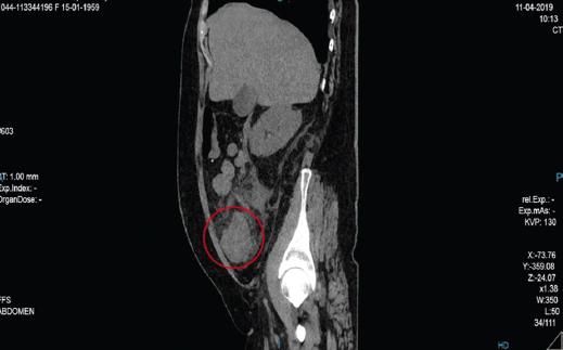 Figura 2 Tomografía abdominal en fase simple, corte transversal, en la que se aprecia una tumoración aparentemente dependiente del ciego (círculo).