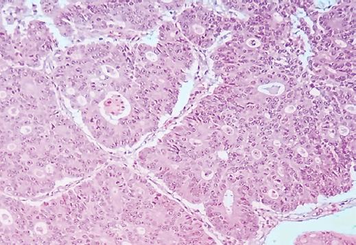 Posterior al evento quirúrgico, la paciente es enviada al área de hospitalización a cargo del servicio de cirugía general, donde se mantiene 24 horas en ayuno, con ileostomía funcional y herida quirúrgica sin complicaciones. Es manejada con antibioticoterapia: metronidazol 500 mg intravenoso cada 8 horas durante 14 días y ertapenem 1 g intravenoso cada 24 horas durante 7 días. Se inicia la vía oral, tolerándola adecuadamente, presentando gasto por ileostomía. Reporte de patología: adenocarcinoma moderadamente diferenciado con características histológicas de carcinoma mixto adenoneuroendocrino de grado 2 moderadamente diferenciado; apendicitis aguda ulcerada, abscesada, transmural, en apéndice posileal (Figs. 5 y 6). Se reporta estudio de inmunohistoquímica: MLH-1 intacto, MSH-6 intacto, CD56 positivo, sinaptofisina positivo, MSH-2 intacto, PMS-2 intacto y cromogranina positivo. Como parte del tratamiento clínico posoperatorio de la paciente se brinda terapia analgésica con base en celecoxib 100 mg por vía oral cada 12 horas por 14 días, así como diclofenaco 100 mg por vía oral cada 12 horas por 7 días. Se añadió tratamiento procinético de tipo cinitaprida 1 mg por vía oral cada 8 horas por 30 días. Igualmente se decide el envío de la paciente al área de oncología médica, donde actualmente continúa en seguimiento y en valoración para el inicio de quimioterapia.