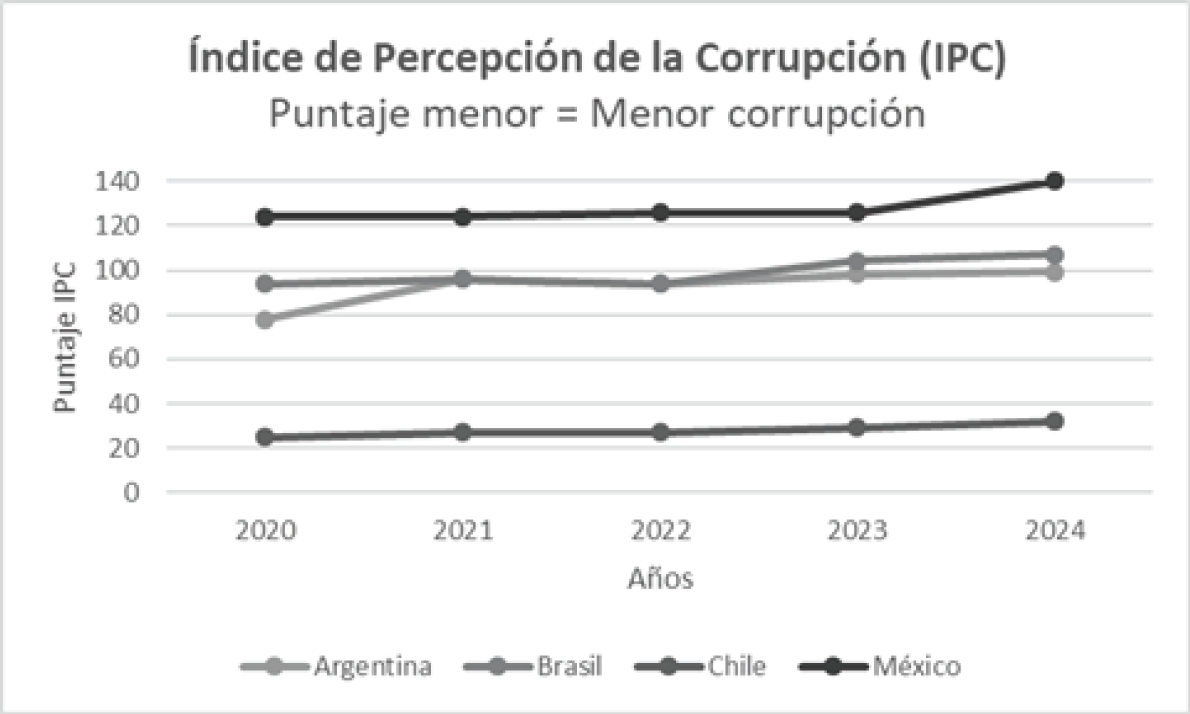 Se tomó como muestra a países latinoamericanos en contextos similares a México, en cuanto al desarrollo democrático, económico y social. Estos son, Argentina, Brasil y Chile. En el ejercicio, se muestra la posición que han ocupado en la clasificación del Índice de Percepción de la Corrupción durante el periodo 2020-2024, con la finalidad de observar cuál es su comportamiento en esa línea de tiempo respecto a México.