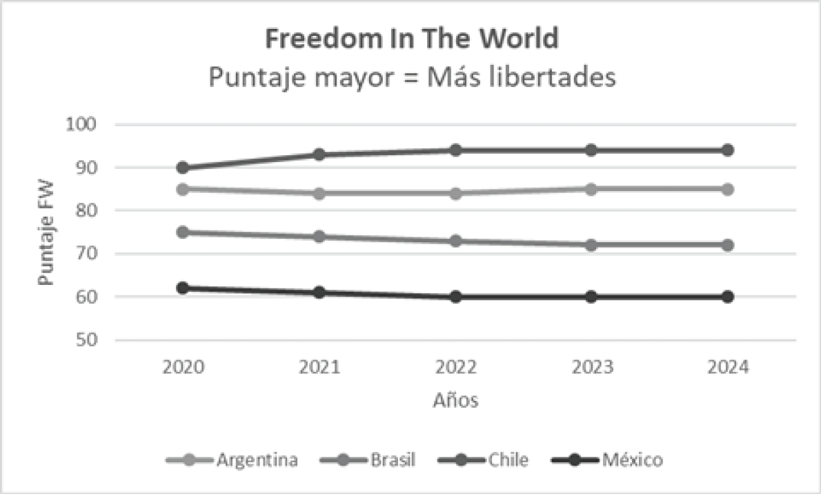 Siguiendo con la metodología de comparación, se volvieron a tomar los mismos cuatro países latinoamericanos, Argentina, Brasil, Chile y México como muestra para argumentar lo plasmado en esta investigación. En esta ocasión se utiliza la clasificación internacional Freedom In The World en el periodo de tiempo de 2020-2024, que mediante su propia metodología califica la situación actual de los Estados en los rubros de derechos políticos y libertades civiles; dentro de esos rubros están incluidos indicadores de fortaleza de la sociedad civil.
