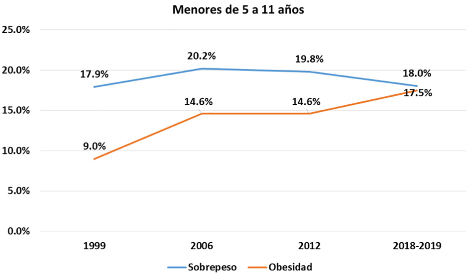 Con respecto a la obesidad en los menores de 5 a 11 años en México, durante 1999 y 2018 se observó una tendencia progresiva más marcada, pues el porcentaje pasó de 9.0% a 17.5%, cuyos datos fuertes se generaron durante 1999 y 2016 con un alza de 5.6 puntos y del 2012 al 2019 con 2.9 puntos porcentuales. Por lo cual, si bien se ha reducido ligeramente el porcentaje de personas con sobrepeso, el porcentaje de personas menores de 5 a 11 años con obesidad se ha incrementado considerablemente en los últimos años. Probablemente el aumento del consumo de comida chatarra pueda ser una de las causas de la obesidad infantil en México (según los datos de recaudación por comida no básica, la producción y comercialización de comida chatarra han aumentado).