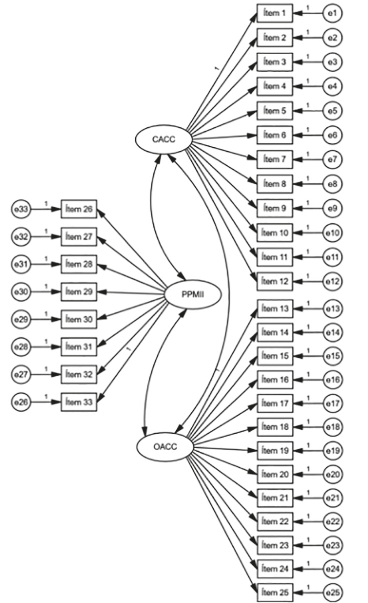 En lo concerniente a la fiabilidad del modelo, calculada con el coeficiente omega (ω) de McDonald, los resultados superaron ampliamente el valor mínimo recomendado de 0.70, lo cual da mayor solidez al instrumento y confirma la ausencia de subescalas no fiables. En particular, se obtuvo un valor de ω = 0.961 para el constructo CACC, ω = 0.967 para OACC, y ω = 0.931 para PPMII, indicando una alta consistencia interna en las tres dimensiones evaluadas.