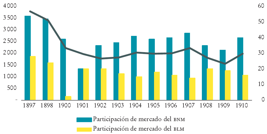 Durante el Porfiriato se constituyó un sistema bancario que fue importante para la expansión económica y necesario para el ordenamiento de las finanzas del gobierno. Esa industria bancaria presentaba una fuerte concentración, principalmente en dos grandes bancos: el Banco de Londres y México (BLM; fundado durante el segundo Imperio, en 1864), y el Banco Nacional de México (BNM; establecido en 1884 con la fusión de dos grandes bancos). Fue en esta época cuando se expandieron las empresas bancarias, principalmente con la legislación de 1897. La evolución de los bancos en México ha recibido atención de muchos investigadores; por ejemplo, Ludlow y Marichal (1986), Marichal (1997), Maurer (2002b), y más recientes como Quintanar Zárate (2017), por mencionar algunas investigaciones relevantes.9