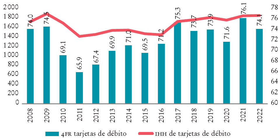 Gráfica 10 Tarjetas de débito: IHH y participación de mercado de los cuatro bancos mayores, en porcentaje (eje derecho)