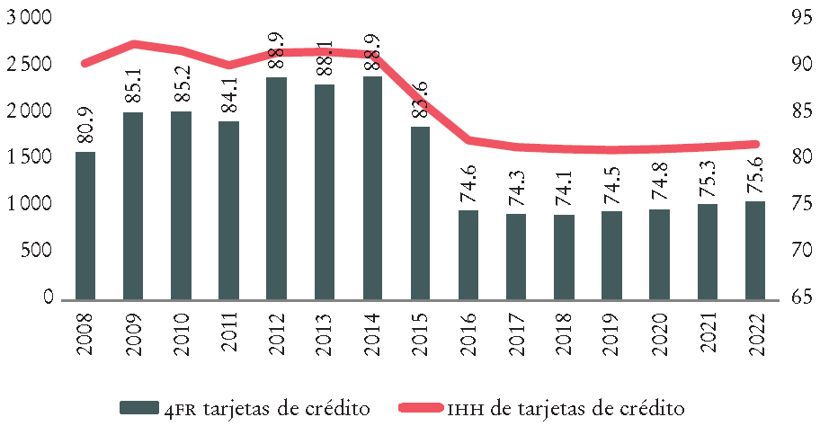 Gráfica 11 Tarjetas de crédito: IHH y participación de mercado de los cuatro bancos mayores, en porcentaje (eje derecho)