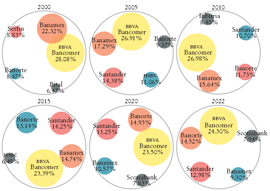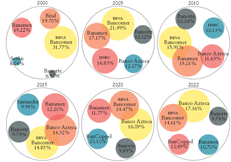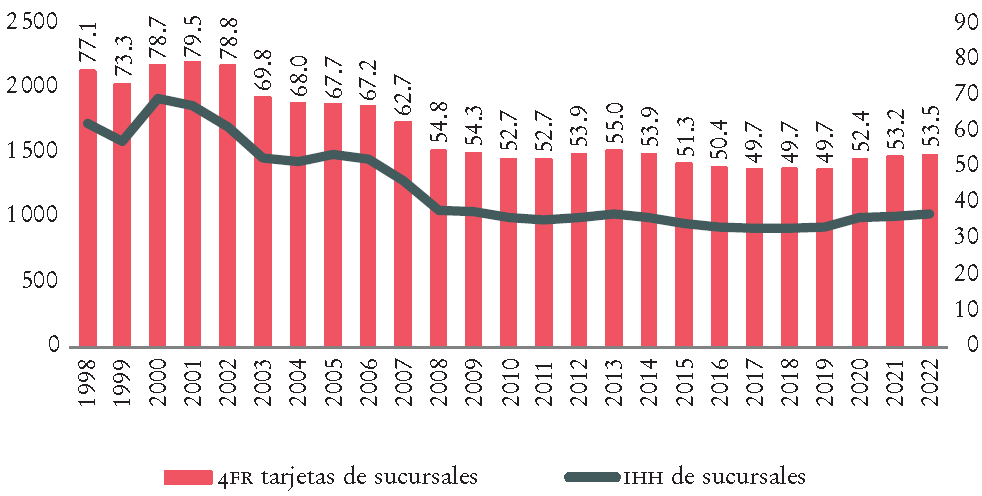 Sin duda, las restricciones regulatorias para la entrada a la industria bancaria fueron un factor que contribuyó a esa concentración. Otro factor importante fue que los bancos que tenían cobertura nacional invirtieron en una expansión de infraestructura en sucursales, las cuales fueron el centro del negocio bancario y contribuyeron a una expansión de los servicios y su democratización, así como a la formación de un sistema de pagos (Del Ángel y Flores, 2022; Del Ángel, 2012).