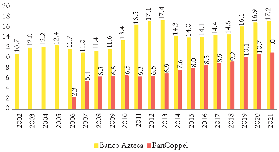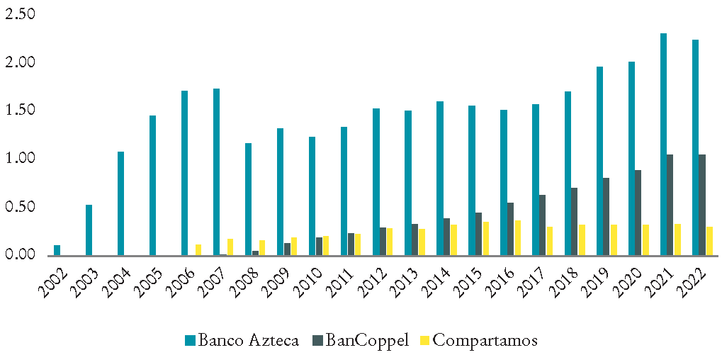 Otro caso de banco de consumo fue BanCoppel, el cual inició operaciones en 2006. Al igual que Azteca, contaba con una red de distribución a través de una cadena de tiendas y una base de clientes a los que vendían productos a crédito. El crecimiento de BanCoppel sin duda ha sido notable; en 2022 era el tercer lugar en número de sucursales.