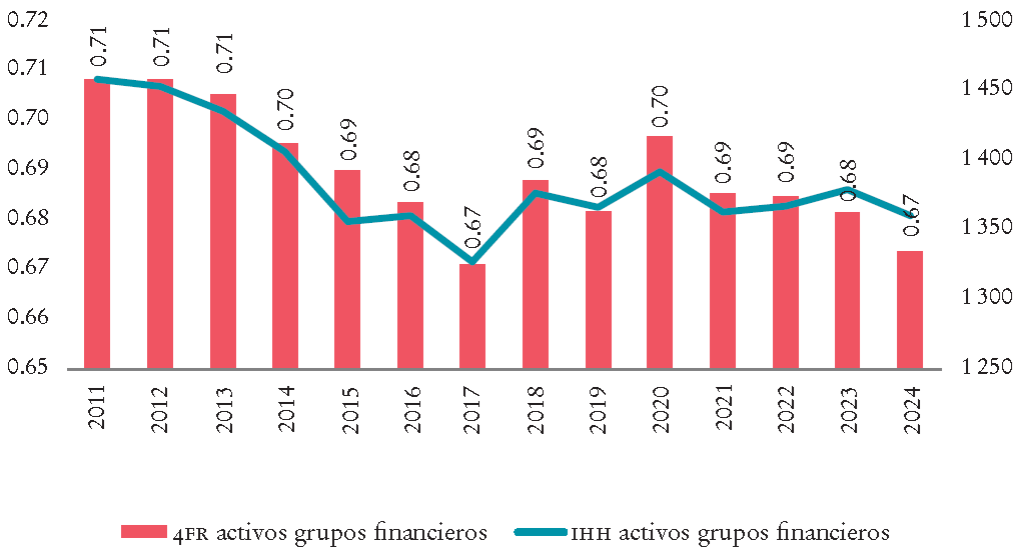 La concentración es una medida que permite identificar la estructura de una industria (Caves, 1964), lo cual es necesario para analizar la historia financiera. Asimismo, es una medida básica en los estudios de competencia. No obstante, no hay una conclusión definitiva en cuanto a la relación entre concentración y competencia. La primera puede ser un indicio de menor competencia, pero no siempre es así. Además, en los sistemas financieros del mundo la relación entre concentración, competencia, eficiencia y estabilidad no es concluyente. La evidencia muestra que sistemas bancarios más concentrados suelen ser más estables, y, por su parte, sistemas más competitivos suelen ser más eficientes (Vives, 2016).