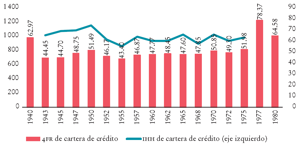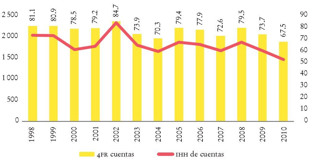 Para el objetivo de este artículo, utilizamos ambas medidas, tanto ratios de participación de mercado de las empresas mayores como el IHH. Esto nos permite analizar la concentración y la posición de los bancos mayores en el largo plazo.