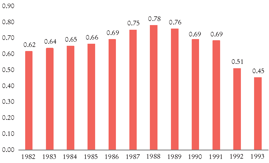 Entre 1982 y 1998 la banca mexicana vivió una secuencia de cambios profundos en su estructura. El primero fue cuando, en septiembre de 1982, el presidente de México decretó la expropiación de la banca privada. En ese entonces había en México 47 bancos privados.14 Tras tal medida el gobierno mexicano inició un nuevo proceso de consolidación del sistema bancario. Uno de los propósitos de las autoridades fue lo que consideraban “equilibrar” el mercado; es decir, tener bancos de tamaño más homogéneo y evitar concentración que consideraban excesiva. También buscaban evitar “redundancias” en el mercado, ya que todos los bancos eran empresas paraestatales, por lo que pensaban que tener bancos compitiendo en una misma región duplicaba funciones. Este proceso, conocido como “racionalización” de los bancos, redujo el número de participantes en la industria y aumentó la concentración, medida por la participación de mercado de los cuatro principales bancos (Del Ángel, 2007; Márquez, 1987). De hecho, la racionalización reforzó la dominancia de los grandes bancos.