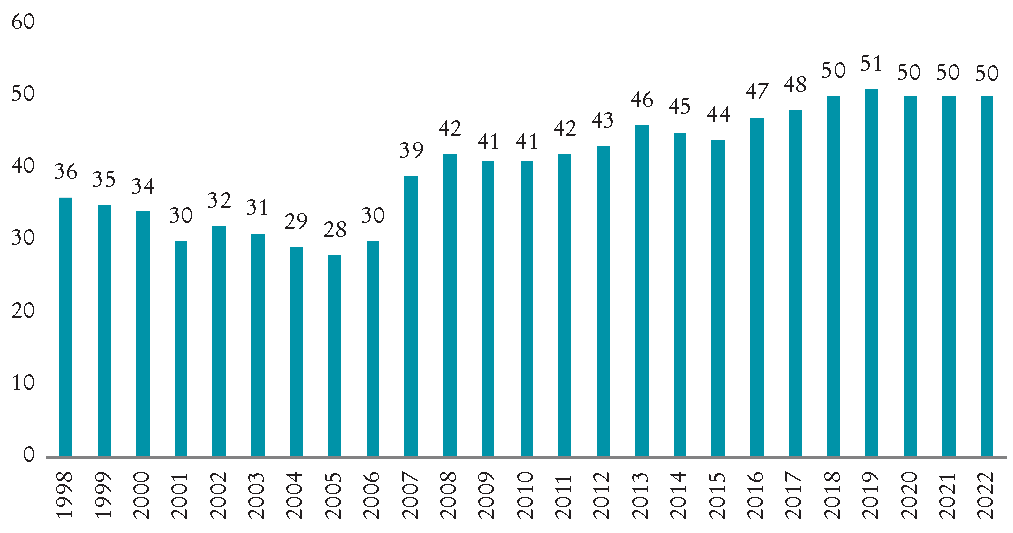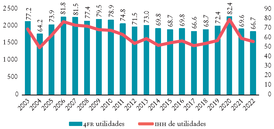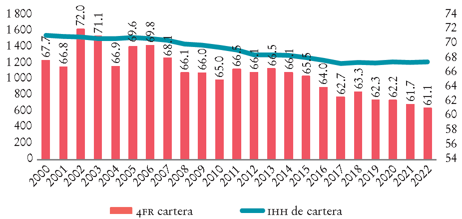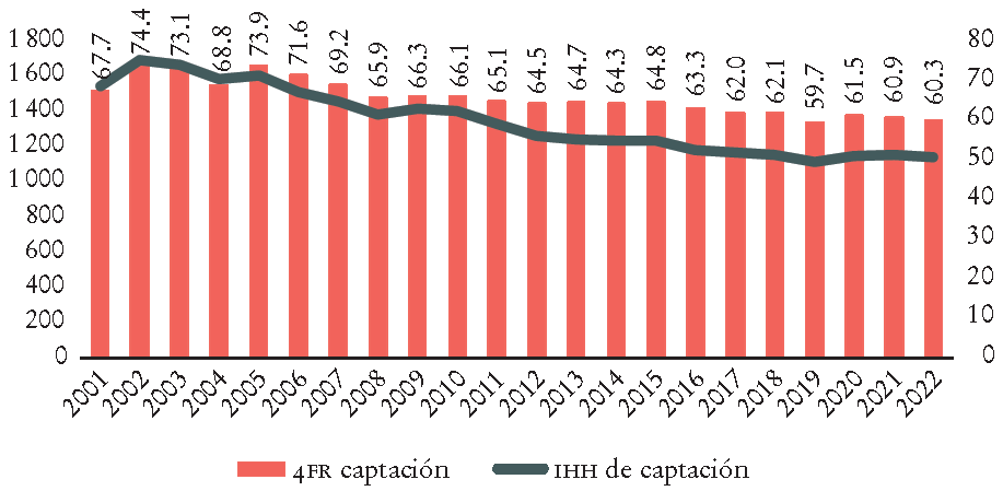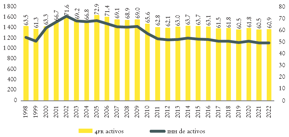 La Gráfica 5 evidencia que los cuatro bancos mayores concentran al menos dos terceras partes de los activos. Pero el IHH tiene valores que podrían considerarse de concentración moderada, además de la tendencia decreciente; de un valor máximo de 1 628 en 2002 ha bajado a 1 112 en 2022. De acuerdo con el valor del IHH, la captación y las utilidades son los rubros de mayor concentración.