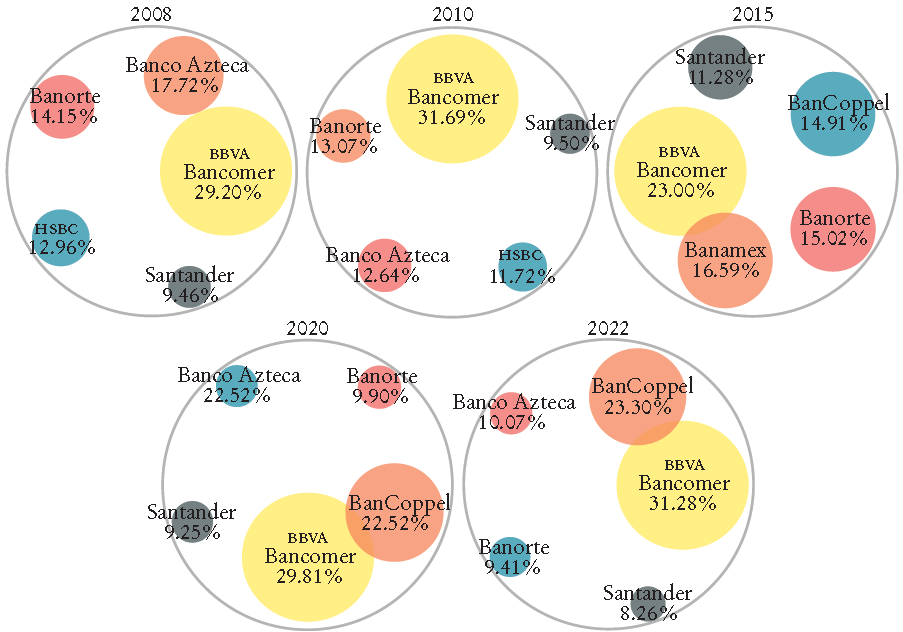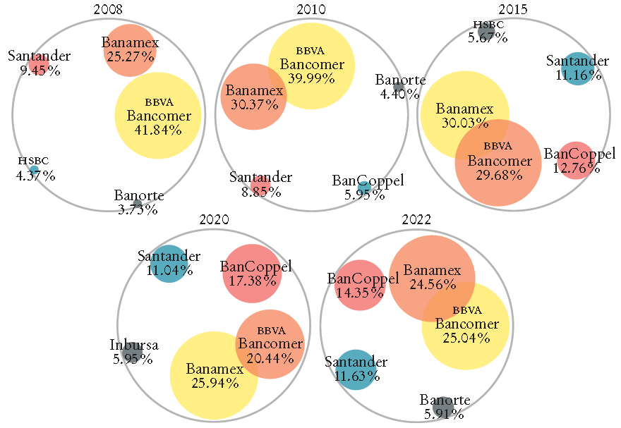 En sus estudios de competencia sobre el sistema financiero, el Banco de México encontró, entre otros resultados, que el mercado de cuentas transaccionales está concentrado en un reducido número de bancos, y que la concentración es más elevada para el mercado de cuentas de nómina. La concentración en cuentas de nómina es mayor, en parte, porque las cuentas de todos los trabajadores de una empresa radican en la misma institución en la que el patrón contrata la dispersión. El estudio del banco central argumenta que la disponibilidad de infraestructura de sucursales y cajeros automáticos es el principal determinante de la concentración (Banco de México, 2017: 7).