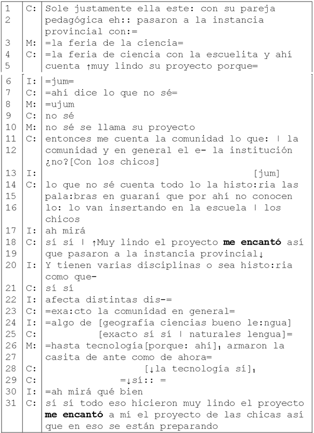 En la línea 10 María anticipa un potencial problema de comprensión: Carmen habla de “No sé ” sin especificar que se trata del nombre del proyecto que está evaluando. En consecuencia, a través de una autoselección que funciona como heterorreparación,9 aclara que se trata del nombre del proyecto educativo que avanzó a la instancia provincial. Destaco esta intervención como una forma de alineamiento al discurso que Carmen viene desarrollando, de nuevo, más que una competencia por el turno se trata de una colaboración. Vale resaltar también la orientación evaluativa (principio de indexicalidad) por parte de Carmen quien mediante la repetición enfática de “me encantó” valora positivamente la labor de Soledad (que está ausente) y, con ello, legitima el rol de su colega en la institución, es decir, asumen una postura temporal y específica (principio de posicionamiento) que se alinea con su trabajo.