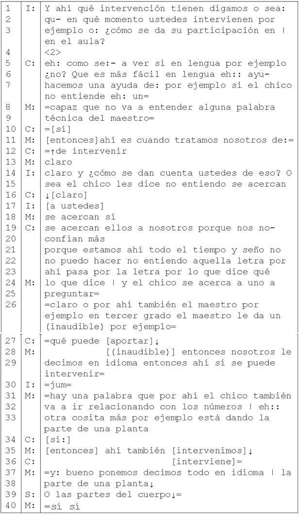A su vez, las secuencias comprendidas entre las líneas 31 y 40 son ejemplos ilustrativos de participación conjunta (Vilar, 2021) y convergencia afiliativa -esto es, afiliación y alineamiento (Bonnin, 2019)- por parte de las tres maestras dado que los solapamientos y enganches producen, por un lado, refuerzos y co-orientaciones y, por otro, adecuaciones y autentificaciones (principio de relacionalidad): las hablantes realizan afirmaciones sobre lo que configuran como real -sus modos de intervención en el aula- y las identidades que construyen discursivamente reflejan posicionamientos similares. En consecuencia, con las valoraciones positivas respecto de sus funciones en aula (principio de emergencia, posicionamiento, indexicalidad), las bilingües consolidan y afirman una imagen autorizada dentro de la institución escolar.