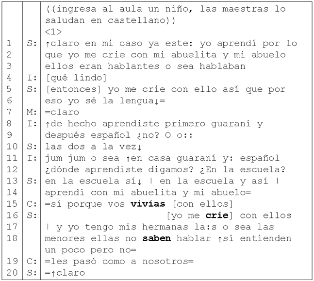 En primer lugar, subrayo la autoselección de Sara luego de un breve silencio y la manera explícita con la que introduce indexicalmente, y a través del pronombre posesivo, su experiencia: “en mi caso”. De este modo, se produce una diferenciación interna dentro del mismo grupo de maestras, caracterizado por el uso de la primera plural. En este (nuevo) marco establecido, las líneas 1-2 y 5 son interesantes porque dan cuenta de las autorreferencias asociadas a formas pronominales y verbales en primera singular: “yo aprendí”, “yo me crie”, “yo sé la lengua”. Así pues, a través del relato de experiencias personales (fragmentos de historia de vida) Sara se posiciona temporalmente (principio de posicionamiento) como una hablante competente y legítima de guaraní ya que lo aprendió/adquirió directamente de sus abuelos.10 Asimismo, es destacable la conciencia metalingüística de Sara al declarar explícitamente su competencia comunicativa, dando muestras de agencia e ideología lingüística (Kroskrity, 2009).