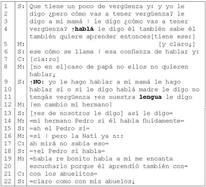 Destaco el modo en que Sara narra la interpelación a su madre frente a la situación de vergüenza que experimenta al momento de hablar su lengua a su nieto. Se posiciona (principio de posicionamiento), entonces, como una militante del guaraní puesto que reivindica y fomenta imperativamente su uso -“hablá le digo”- sin dejar de recurrir al uso de formas indexicales (principio de indexicalidad) -“es nuestra lengua”-. Cabe agregar que en este fragmento, la postura (stance en Bucholtz y Hall, 2005) adoptada por Sara muestra su agencia y su capacidad para disputar paradigmas ideológicos naturalizados (Kroskrity, 2009): interpela el orden social dominante que sitúa a las lenguas indígenas y a sus hablantes en posiciones subalternas y marginales. En las líneas 5 y 7, tanto Carmen como María apoyan lo dicho ya que lo expuesto por Sara no es un caso aislado. De hecho, en otro momento de la entrevista Carmen recordó episodios de burla y discriminación (proceso de ilegitimidad, principio de relacionalidad) de parte de su profesor de secundaria por su manera de hablar; es de notar el vínculo con el poder y el rol que juegan las instituciones (la escolar en este caso) en la formación -y desvalorización- de las identidades.