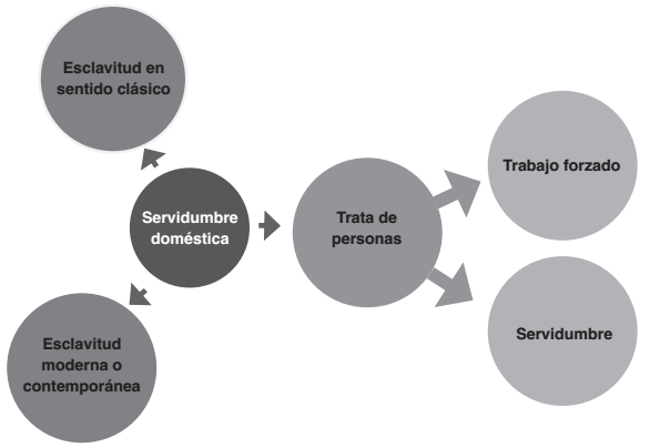 La principal diferencia entre trabajo forzado, servidumbre y esclavitud doméstica es que en los primeros conceptos la explotación humana no alcanza a poner de manifiesto las facultades asociadas generalmente con la propiedad, sea de jure o de facto, que se dan en la esclavitud (Allain 2009: 304, Bhoola 2016: ap. 5). Lo anterior no quiere decir que el trabajo forzado o la servidumbre constituyan un grado menor de violación a los derechos humanos (Gulnara 2010: ap. 25), pues también atentan directamente contra la dignidad humana. Asimismo, es importante recordar que tanto la servidumbre doméstica como el trabajo forzado, la esclavitud y la esclavitud moderna pueden derivarse del trabajo doméstico realizado en condiciones inhumanas o en contextos de abuso (Figura 1). Por esa razón, es importante subrayar los factores que reforzaban la servidumbre doméstica antes de la pandemia de COVID-19.