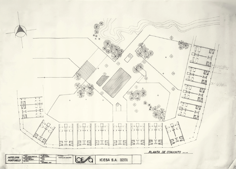 Figura 1 Plano de planta de conjunto de la Hotelera Porto Bello, Franz Beer, 1982, Puntarenas, Costa Rica.