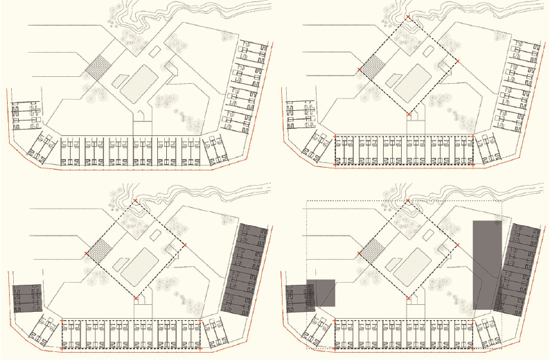 Beer desplaza este elemento en línea paralela al derrotero del lote disponiendo las habitaciones hasta lograr una “U” en planta. En el centro, la piscina queda inscrita en un cuadrado rotado aproximadamente cuarenta y cinco grados con respecto al bloque de habitaciones rectangular que está ubicado al sur del proyecto. La ortogonalidad con la que están dispuestas estas secciones del hotel sugiere que inicialmente las habitaciones ubicadas al este y al oeste seguían esta estructura. Sin embargo, Beer privilegia la forma irregular del lote por encima de un orden geométrico previo. El conflicto generado por estos cambios de dirección y los ángulos atípicos sustentan esta idea. El diseño de las esquinas sur del proyecto (dos habitaciones y la recepción) se asemeja más a un fallido intento de resolver el desarrollo lineal que a una exploración basada en una geometría irregular. En otras palabras, aunque el proyecto parece haber sido concebido con una estructura ortogonal, su adaptación al lote dio lugar a una composición en la que la arquitectura se integra al lugar (Figura 2).